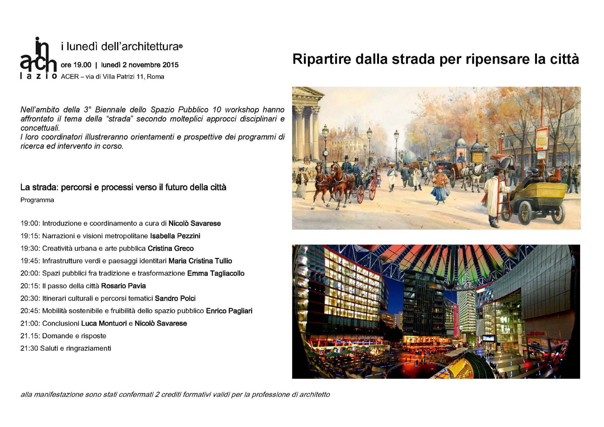 Lunedì 2 novembre 2015, ore 19:00, presso la sede dell’ACER in Via di Villa Patrizi 11, Roma, nell'ambito del programma “I Lunedì dell’Architettura” dell’IN/ARCH, parteciperò al dibattito “La strada: percorsi e processi verso il futuro della città”, con un intervento dal titolo "Narrazioni e visioni metropolitane". In allegato il programma.