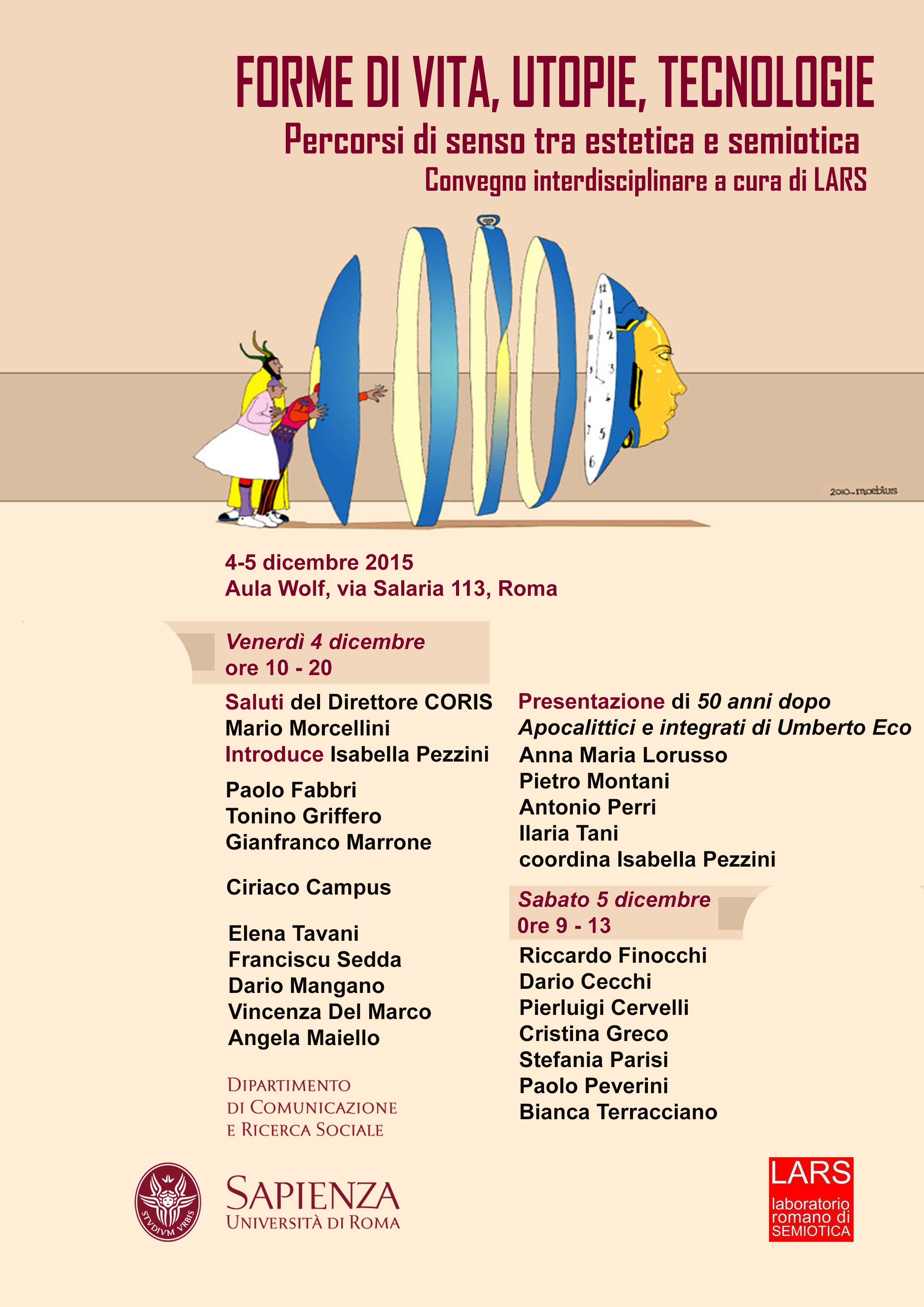 Nell'ambito delle attività della cattedra di Semiotica diretta da me, il laboratorio Romano di Semiotica LARS in collaborazione con il CoRis, promuove il convegno interdisciplinare dal titolo, "Forme di vita, utopie, tecnologie. Percorsi di senso tra estetica e semiotica", che si terrà il 4-5 dicembre 2015, presso l'Aula Wolf, via Salaria 113, Sapienza Università di Roma. In allegato locandina e programma dell'evento.