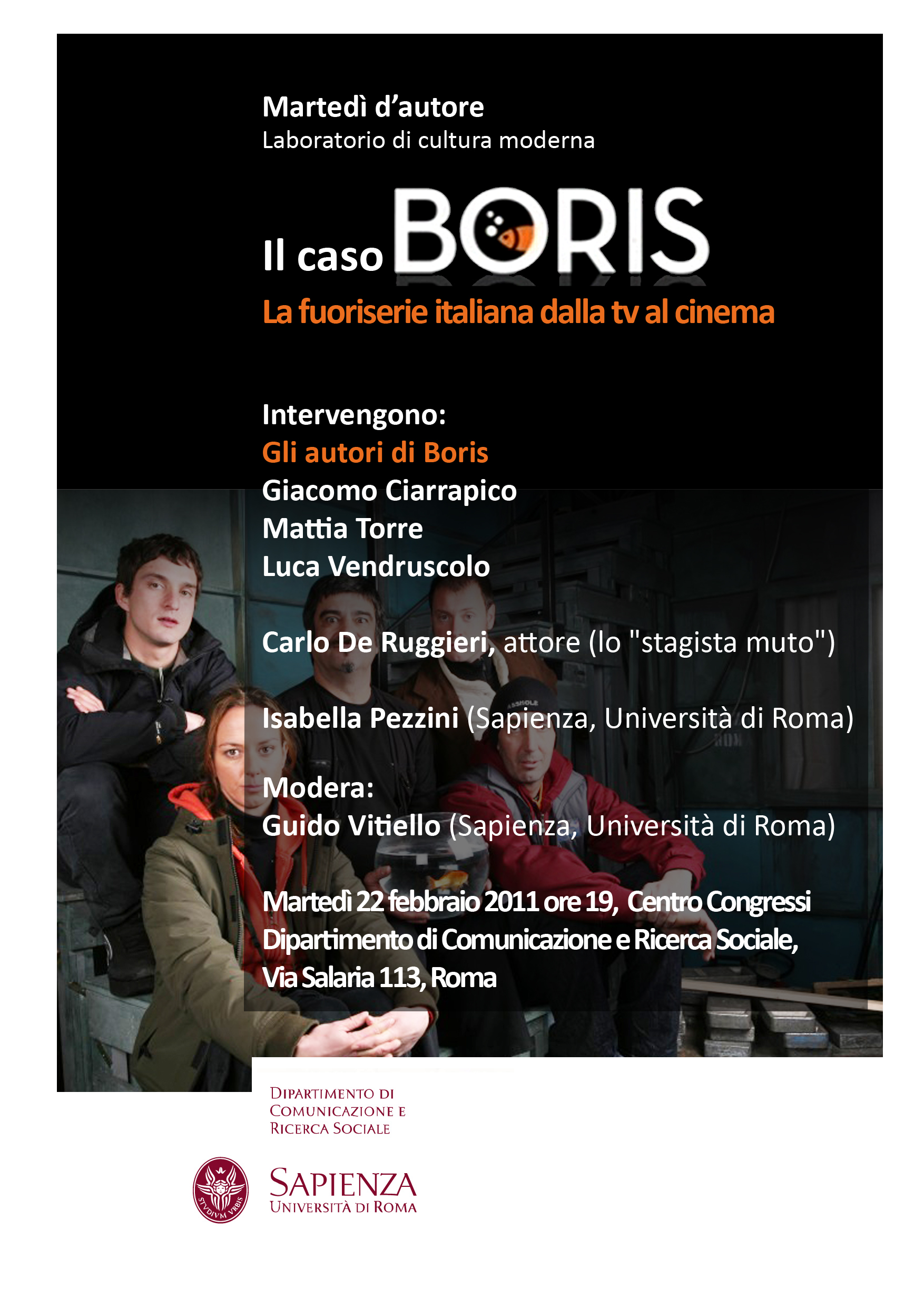 Incredibili e grotteschi intrighi amorosi che coinvolgono carabinieri, medici, avvocati; raccomandazioni, segnalazioni e “favori” che coinvolgono stelle e stelline del piccolo schermo. È la tv italiana vista attraverso l’occhio dissacrante di Boris, la “fuoriserie italiana” diventata un “caso” televisivo e ora pronta al passaggio al grande schermo con Boris – Il film, nei cinema italiani dal 1° aprile. L’incontro settimanale Martedì d’autore dedica la serata del 22 febbraio al fenomeno Boris e alle ragioni di un successo imprevisto e imprevedibile. L’evento si terrà alle ore 19 presso il Centro Congressi del Dipartimento di Comunicazione e Ricerca Sociale. Esordita su Sky nel 2007 e giunta alla terza stagione, la serie televisiva Boris si è proposta come alternativa alla fiction di produzione nazionale che affolla il palinsesto della tv pubblica e commerciale. Per raggiungere questo obiettivo, Boris ha scelto di raccontare vizi (tanti) e virtù (poche) della società italiana odierna focalizzando l’attenzione proprio sul mondo produttivo della fiction. Un “gioco” metatelevisivo che ha portato successo a un programma nato come di nicchia e ora giunto alla conquista del pubblico cinematografico. Il film, in sintonia con l’intento originale, trasporta le nevrosi dell’ambiente lavorativo italiano e la satira di costume dal set televisivo a quello cinematografico, raccontando la grottesca avventura produttiva di un film. Sarò presente all’incontro con gli autori della serie tv e del film Giacomo Ciarrapico, Mattia Torre e Luca Vendruscolo; l’attore Carlo De Ruggieri. L’incontro sarà moderato da Guido Vitiello (Sapienza Università di Roma). In allegato la locandina dell'evento e il saggio di Isabella Pezzini "Uno sguardo trasversale sulla fiction Italiana - Il caso Boris".