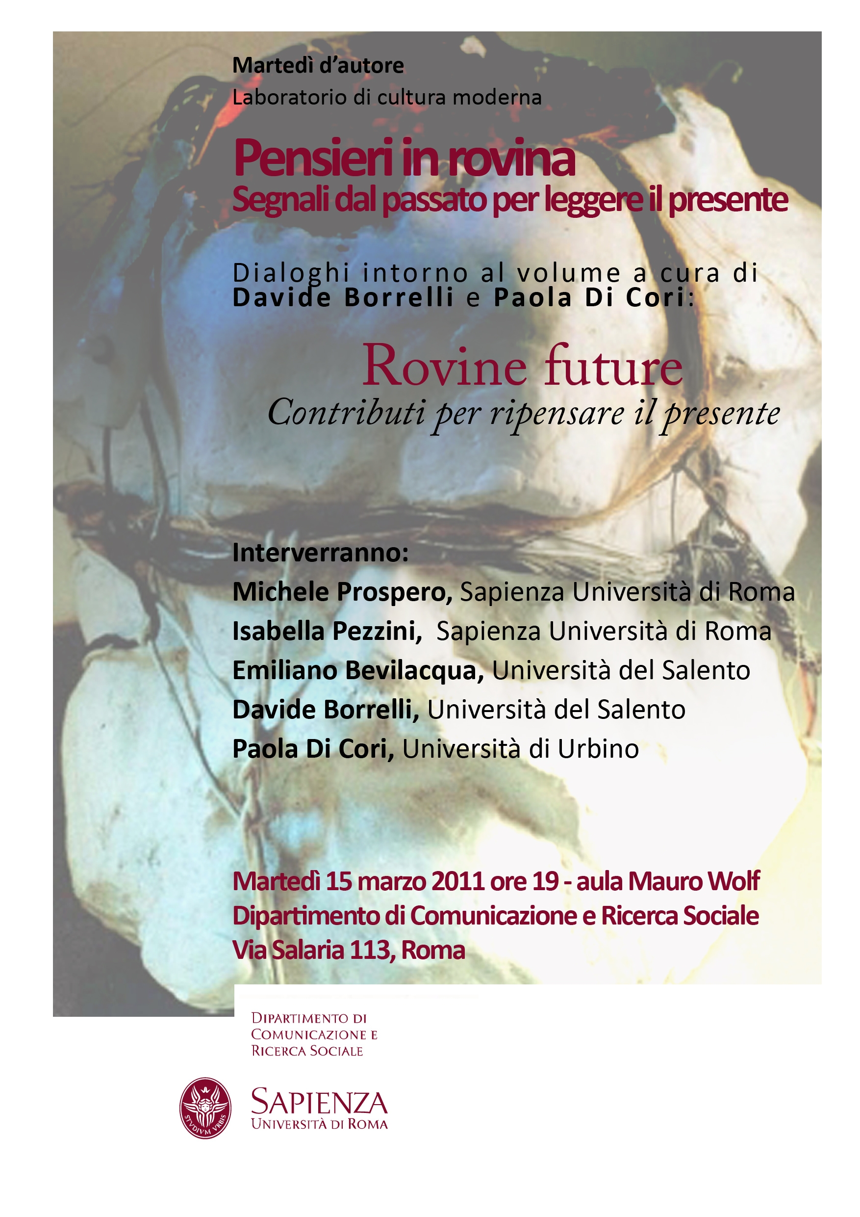Pensieri in rovina. Segnali dal passato per leggere il presente Martedì d`autore Dialoghi intorno al volume “Rovine future”, a cura di Davide Borrelli e Paola Di Cori 15 marzo 2011, ore 19, presso l’Aula Wolf, Dipartimento di Comunicazione e Ricerca Sociale, Università degli studi di Roma "Sapienza", via Salaria 113. Quante volte, osservando le rovine di un tempo passato, ci siamo posti domande relative a quel passato? Ma se le risposte a tali quesiti fossero utili per interpretare il presente? Le rovine invitano a valutare con occhio critico quel che rimane e ad espellere ciò che all’improvviso appare come estraneo. Ma dalle rovine si può anche ricostruire, si può dare vita ad una realtà trasformata, dotata di un senso nuovo.